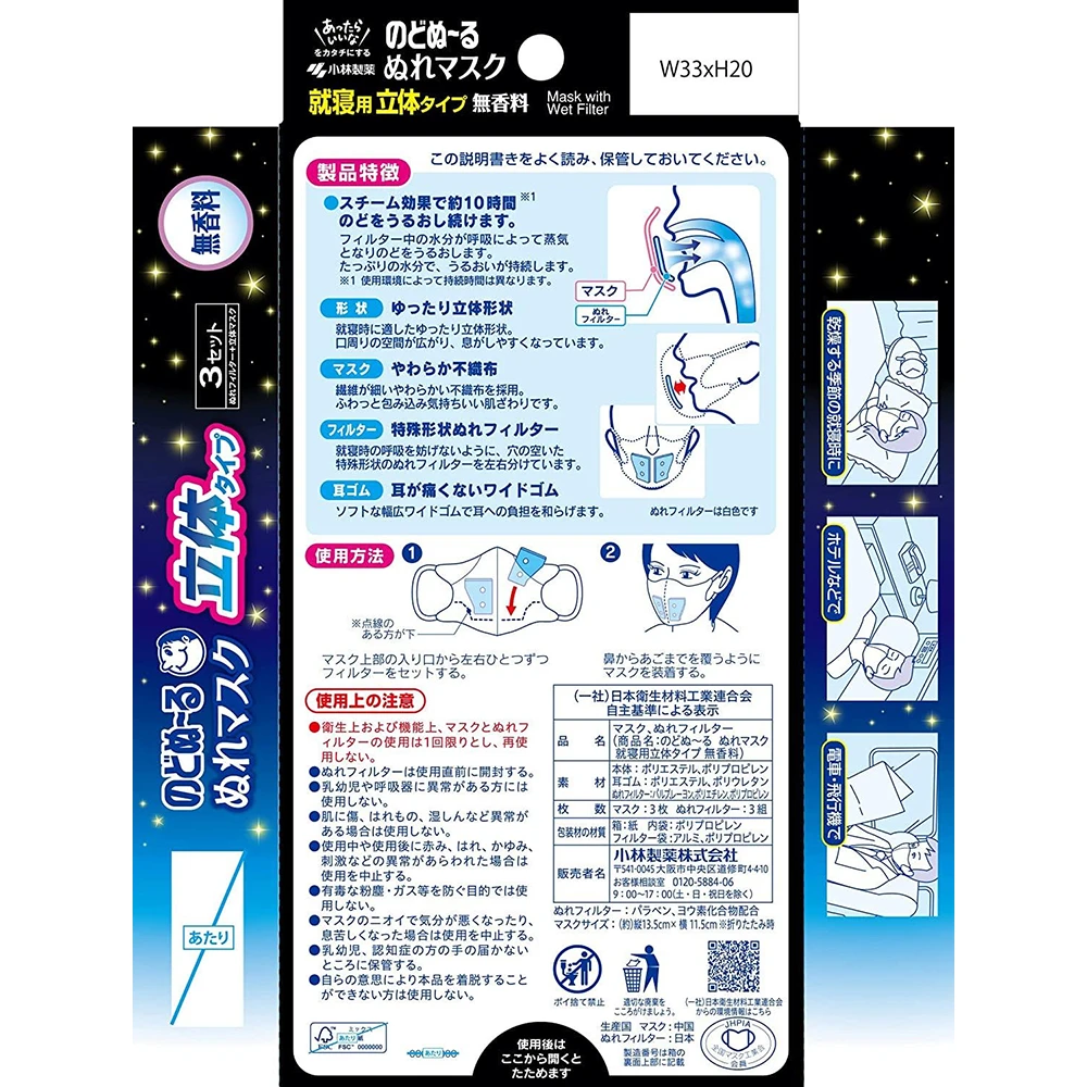 Kobayashi Moisturizing Pharmaceutical ‘Nodonuru Wet Mask’ for Sleep, 3D Type. 無香料 口鼻加湿口罩无香料 3片装