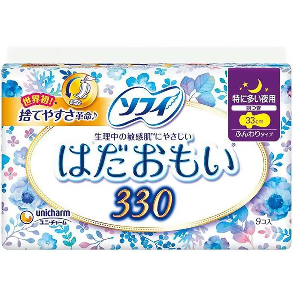 • Sofi Hadaomoi Pad for Night 330 9pcs unicharm尤妮佳苏菲卫生巾敏感肌肤夜用40CM8片棉柔