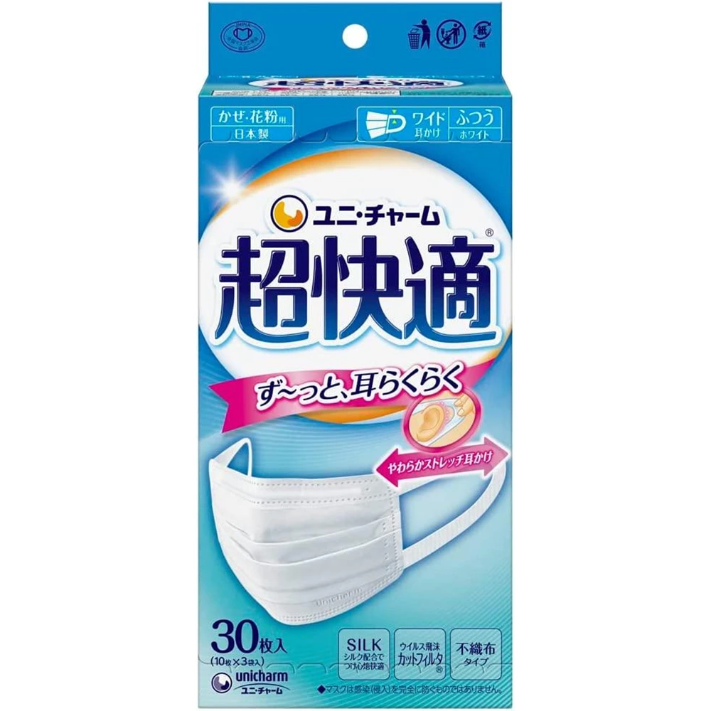 • Unicharm 超快適 Normal Mask for PM2.5 30pcs 超快适防病毒口罩医用口罩99%防病毒防飞沫30片装 普通尺寸/男女