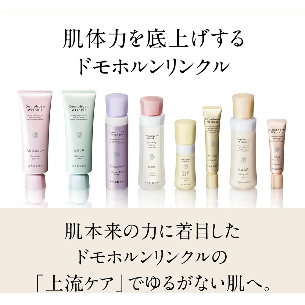 Emulsion domohorn wrinkle【7号保护乳液】它的作用不仅仅只是保湿,而是形成一层保护膜,把乳霜20等所赋予的营养锁住,防止流失。由于是最后一个保养步骤,所以要有保护的功效,巩固屏障功能,使肌肤内外均免受伤害。