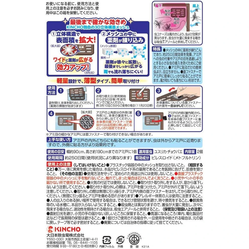 Kincho Mushi Connors 3D Insect Repellent For Screen Doors, 250 Days, 2 Pieces, Odorless日本金鸟Kincho驱蚊贴3D立体驱虫贴纱窗驱虫贴魔术贴驱虫挂250日有效期2件入