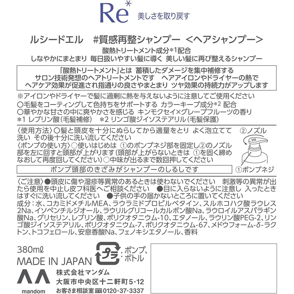 LUCIDO-L #Texture Reset Shampoo [Damage Repair] Kinmokusei x Grapefruit Scent 380ml