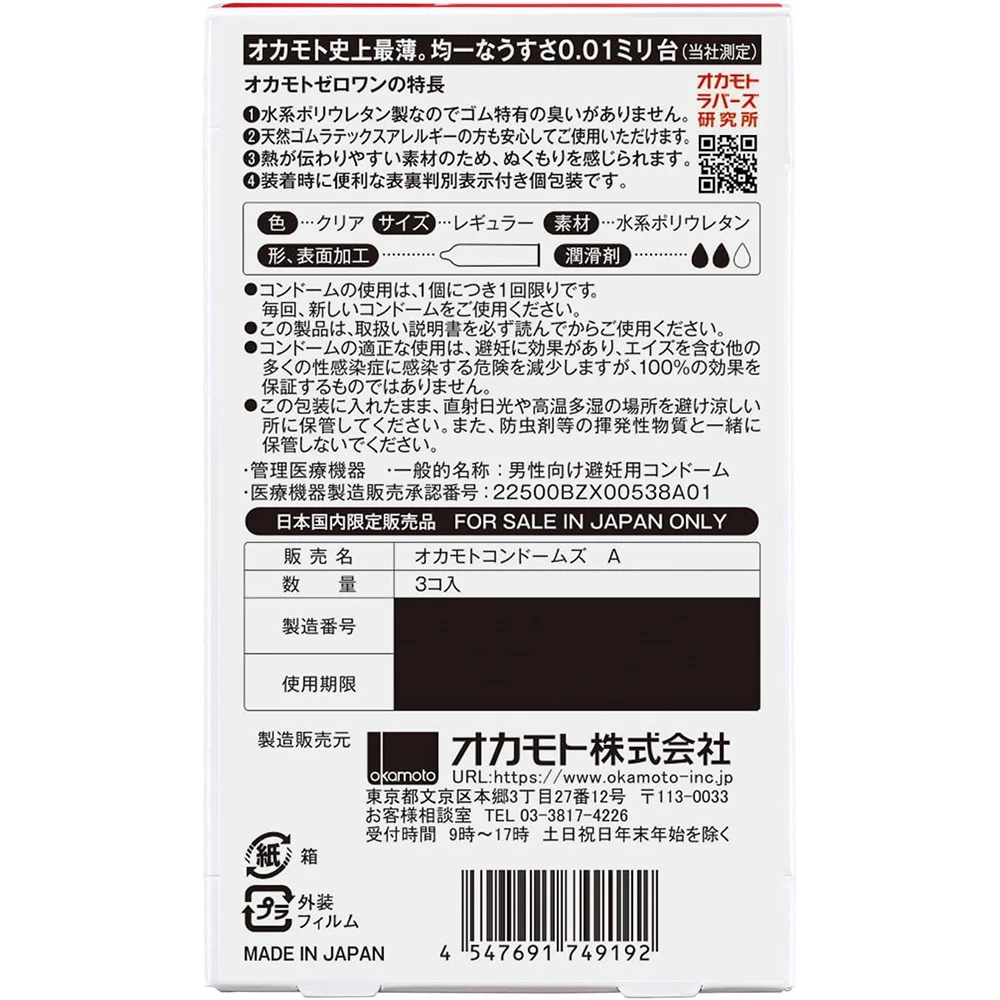 Okamoto Condom 0.01 3pcs 冈本001避孕套安全套超薄0.01mm男女用持久型 冈本001标准版中码3只装