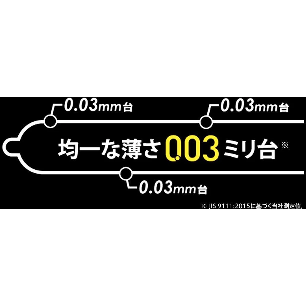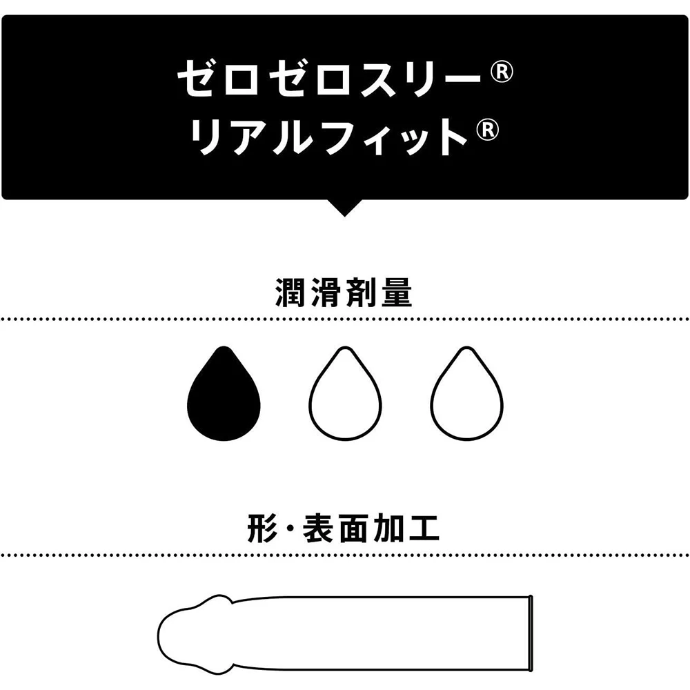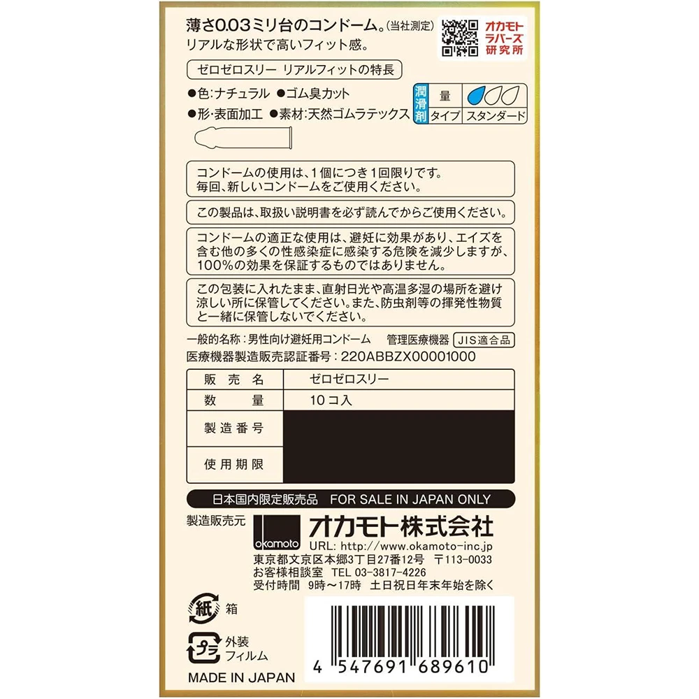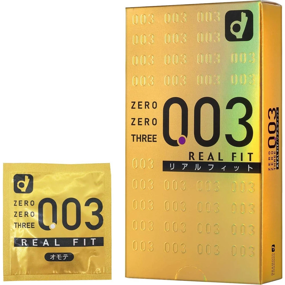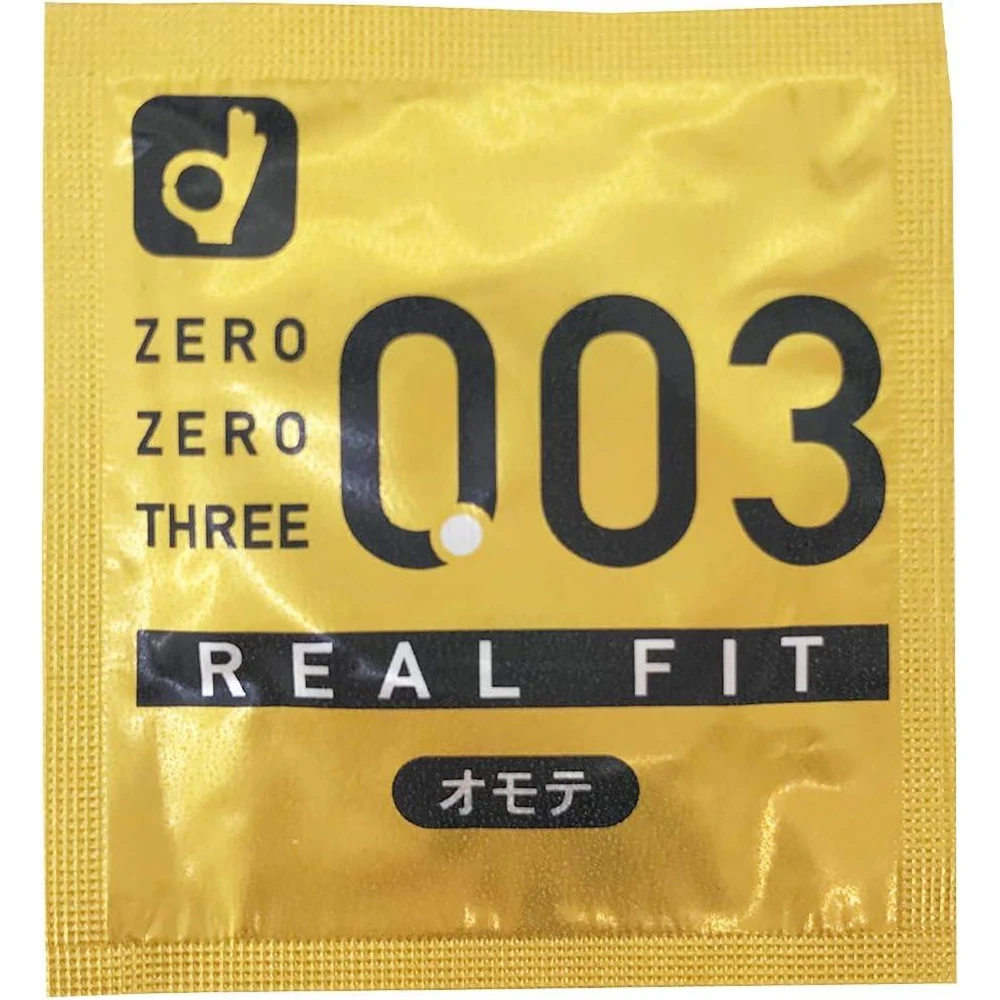 Evolved 003 ! Its name is 003 Real Fit! ! 1. Realistic shape With a constricted part added to the condom, you can get a firm fit without feeling stiff or sagging. There is no “semen pool” at the tip, so you can get a good fit. It is easy and hygienic to put on because there is no need to remove the air. 2. thin! thin! Same as 003 (Zero Zero Three), uniform thickness of 0.03 mm (according to our measurements). Touch it, put it on and be surprised at how thin it is! Improved fit Feels like bare skin! 003! ! 3. Rubber odor reduction Okamoto’s unique technology cuts the rubber odor. Four. Front and back identification packaging Adopted individual packaging that allows you to know the front and back of the condom before opening. The texture of the front and back of each package is different, so you can distinguish between the front and back even in the dark. Front and back discrimination packaging
