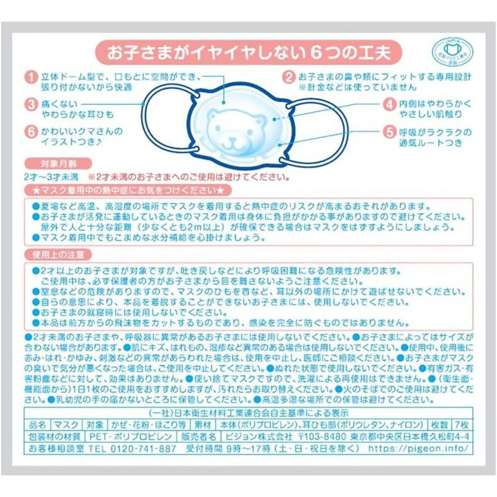 Pigeon First Mask for Baby 贝亲口罩宝宝口罩婴幼儿童口罩宝宝口罩2岁到7岁可用 7枚入