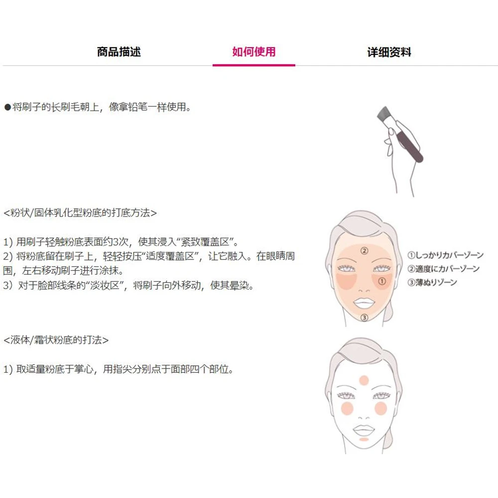 无论液体,固体或者乳霜状的粉底均可以使用。斜角的设计,手感超级好,特别贴服脸部线条。