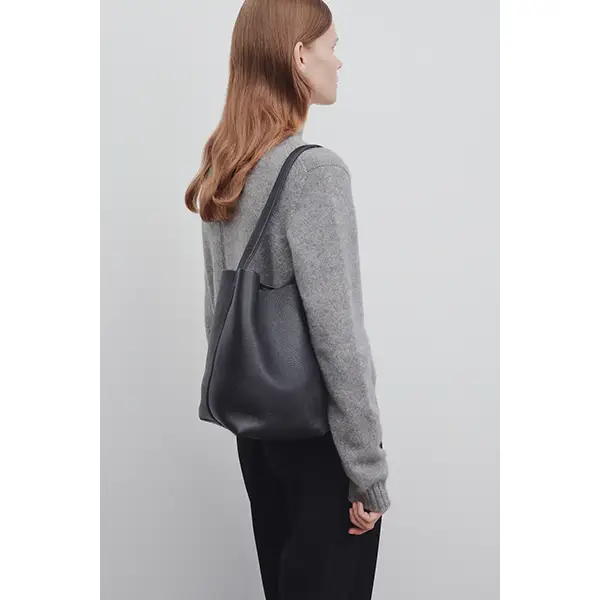 经典托特包,粒面小牛皮材质,内部滑扣开合,扁平提手。